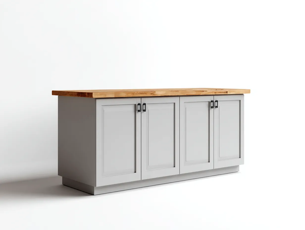Dieses Sideboard verbindet großzügigen Stauraum mit einer ruhigen und wohnlichen Gestaltung. Der helle Korpus und die naturfarbene Massivholzplatte bilden eine harmonische Kombination, die sich gut in Esszimmer, Küche oder Wohnbereich integrieren lässt. Die breite Oberplatte eignet sich hervorragend als praktische Ablagefläche für Geschirr, Küchenzubehör oder dekorative Wohnaccessoires.