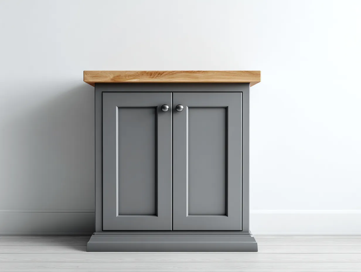 Der Korpus besteht aus robustem Holzwerkstoff in Grau. Die obere Platte wird aus Massivholz gefertigt und zeigt eine natürliche Maserung mit warmer Farbwirkung. Die Oberflächen sind sorgfältig verarbeitet und pflegeleicht gestaltet. Runde Metallgriffe ergänzen das Erscheinungsbild und unterstützen eine komfortable Nutzung im Alltag.